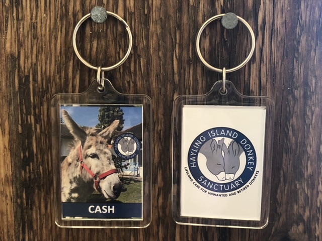 Acrylic key fob with silver metal ring so you can carry your favourite donkey around wherever you go. Features a photograph of Cash on one side and the Hayling Island Donkey Sanctuary logo on the reverse.